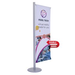 - Banner rails slide into a groove on the central post and can be adjusted for custom banner sizes (call for quote; restrictions may apply)
